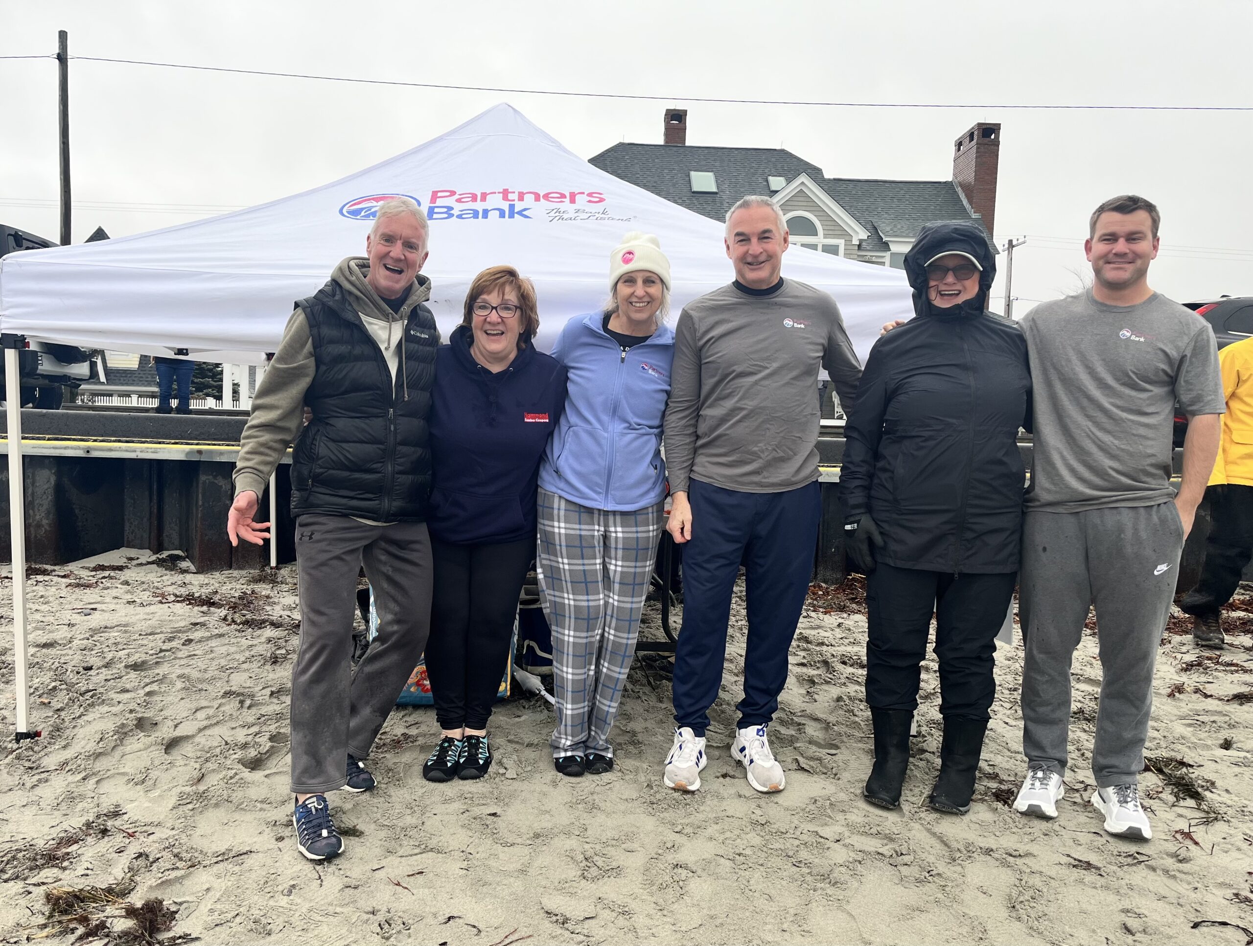 In addition to the sponsorship, eight Partners Bank employees and friends proudly attended the event, six of whom tackled the 40-degree ocean temperature. Blaine Boudreau, Karen Gellatly, Rich Goodenough, Stephen Sessler, Kimberly Stewart, and Stephanie Wilkins amped themselves up during the countdown before sprinting toward the Atlantic Ocean. Before and after the daring plunge, the high winds and rain made conditions feel even colder, but the participants did not concede from the challenge.