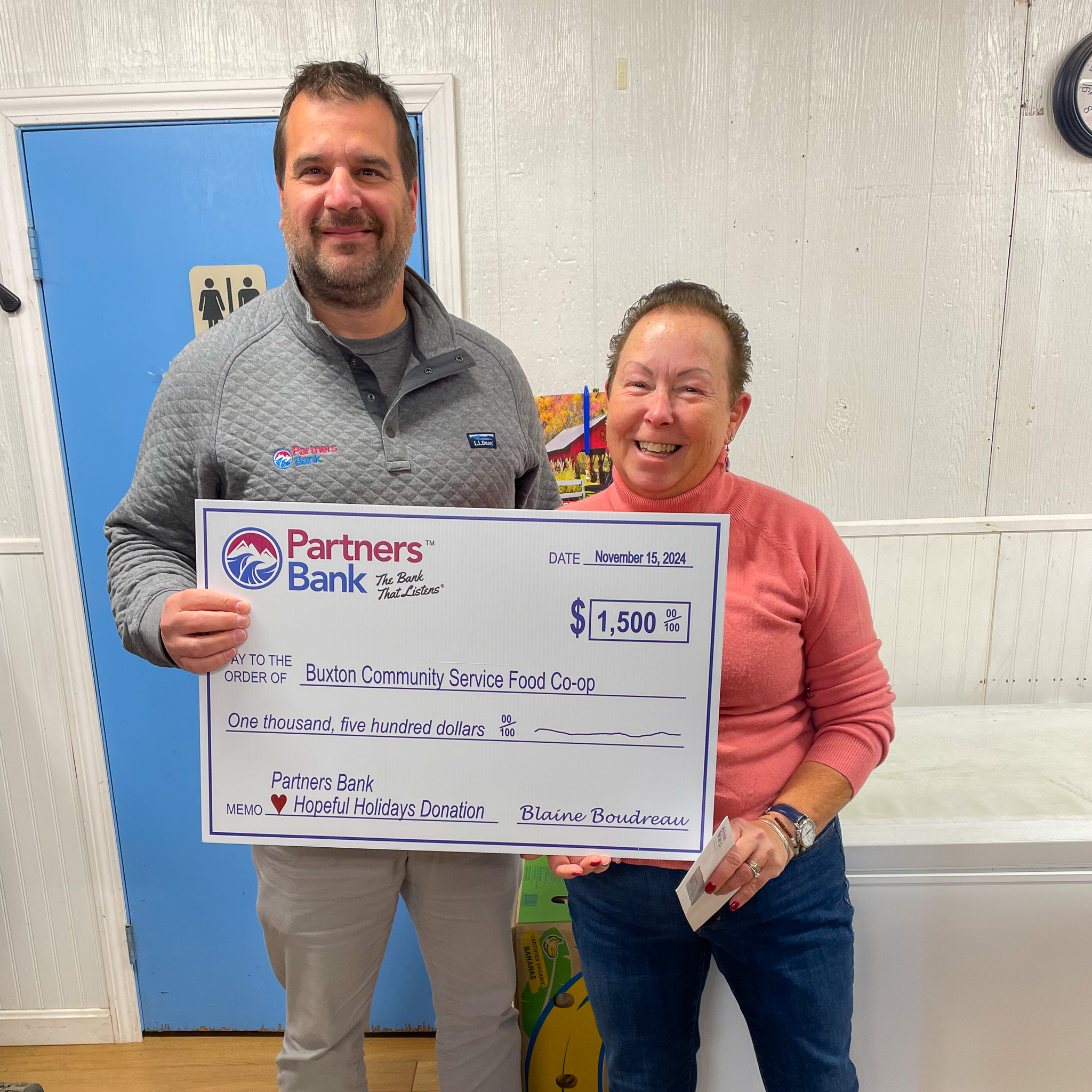 Buxton, ME – The holidays are a time of cheer, joy, and togetherness. While a lot of us will get to experience the pleasures of the holidays, Partners Bank wants to remember those who are not as fortunate. To some, the holidays are a sad reminder that their dinner table will be short on turkey, ham, vegetables, bread, and other holiday favorites. That is where the Partners Bank ♥ Hopeful Holidays Donation comes in.