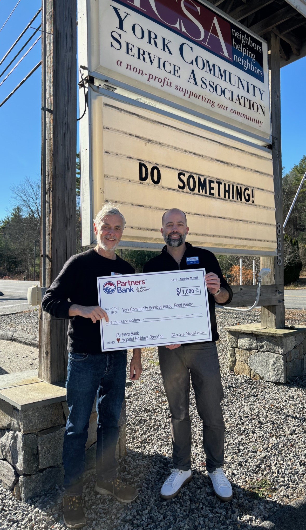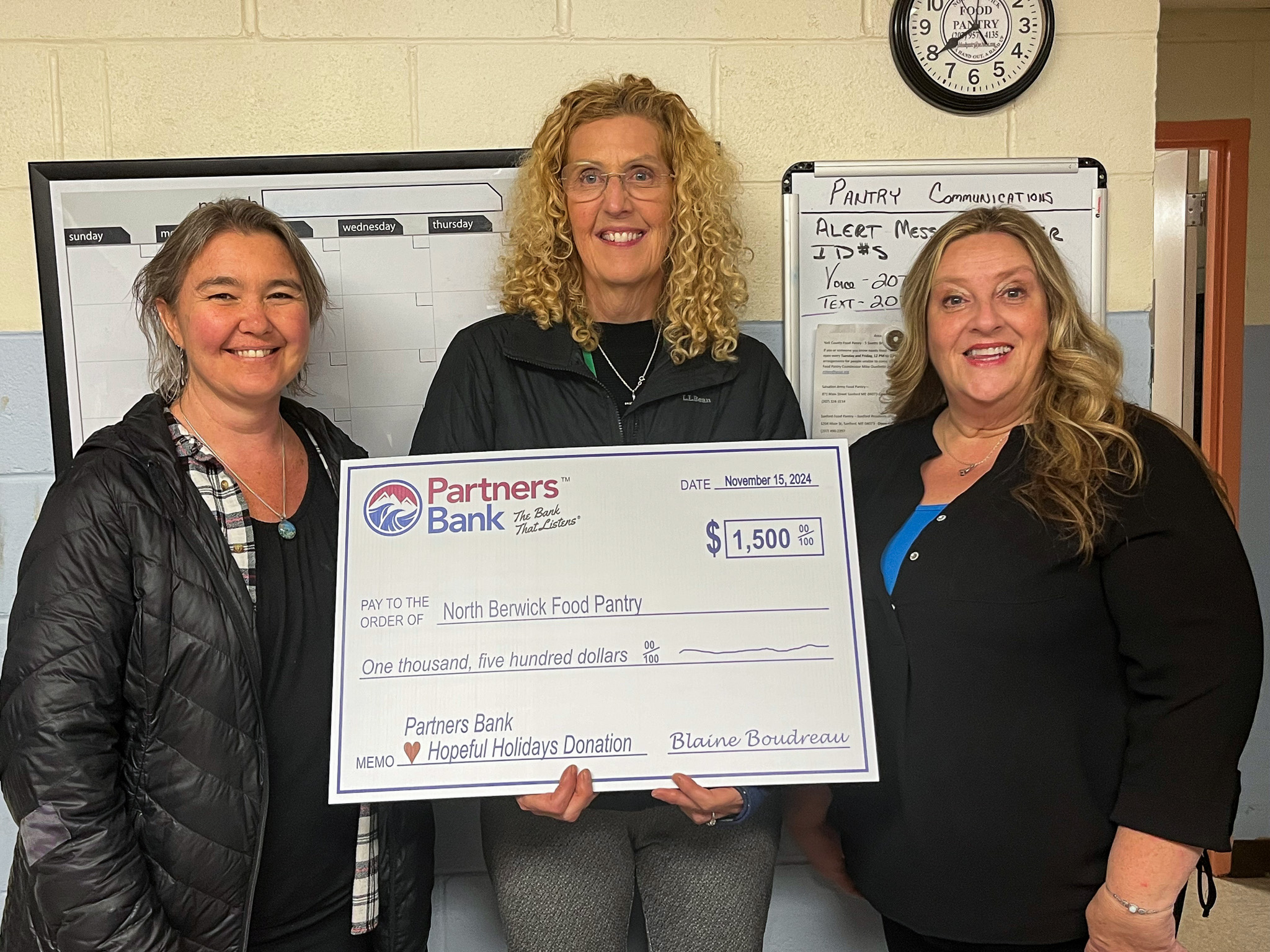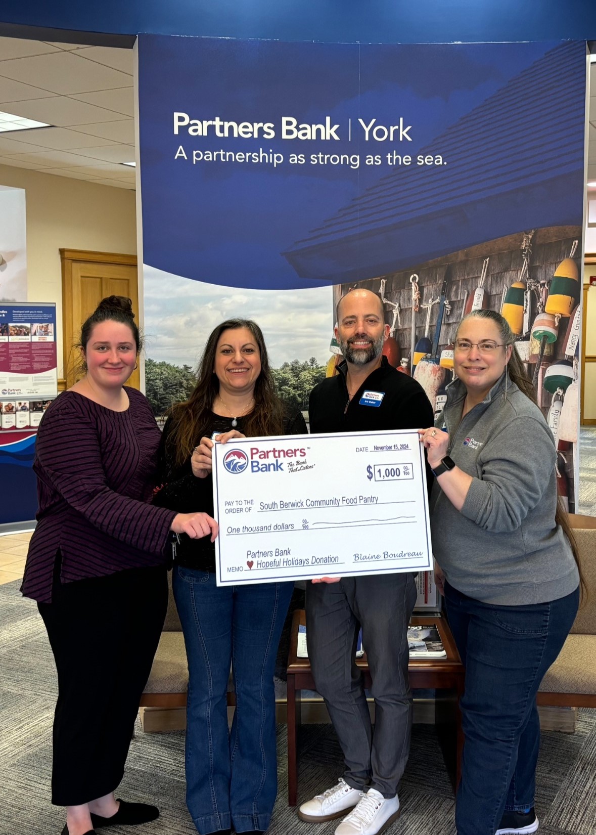 - The team at the Partners Bank York location donates $1,000 to the South Berwick Community Food Pantry.
